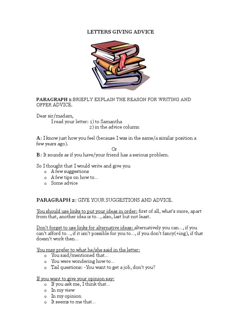 Have a look at the sample letter of advice to employee for poor performance. There are two modal verbs we often use for giving advice: 'should' and 'ought to'. for and give advice on everyday topics. Every idea in the paragraph should be justified and developed (example, explanation, consequence).